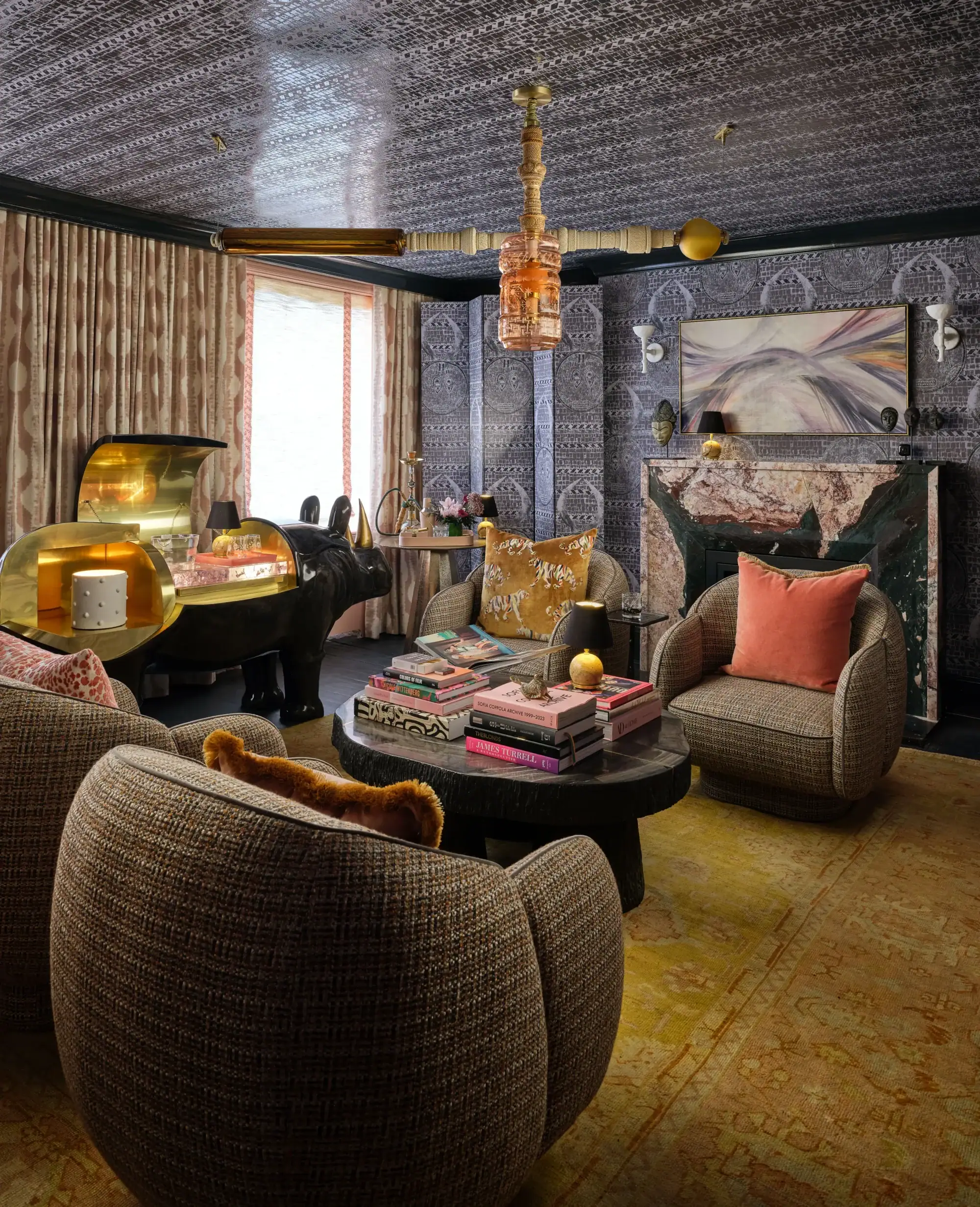 The room itself unfolds as a layered narrative of craftsmanship, texture, and history. Moroccan arches frame cozy niches, patterned surfaces create rhythm and depth, and playful juxtapositions invite exploration. At the center of the design is a whimsical rhinoceros-shaped bar—a sculptural anchor that infuses humor, sophistication, and character into the speakeasy concept. This focal point embodies Andrea’s signature approach: blending untamed luxury with a touch of the unexpected.
