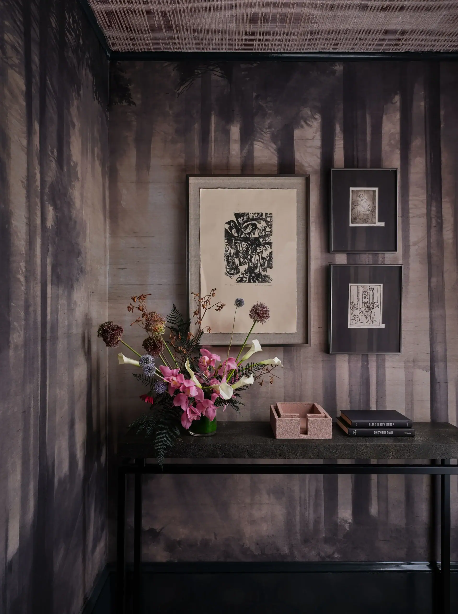 At the foundation of the room is “Guli Mask”, a striking wallcovering from Andrea’s upcoming wallpaper collection with The Vale London. The pattern originates from original artwork by her grandmother, Elizabeth Monath, a student of Fernand Léger whose career as an artist spanned continents. The drawing was created during Monath’s visit to Andrea’s childhood home in Ibadan, Nigeria, and it remains a deeply personal reminder of her global upbringing and creative legacy.
