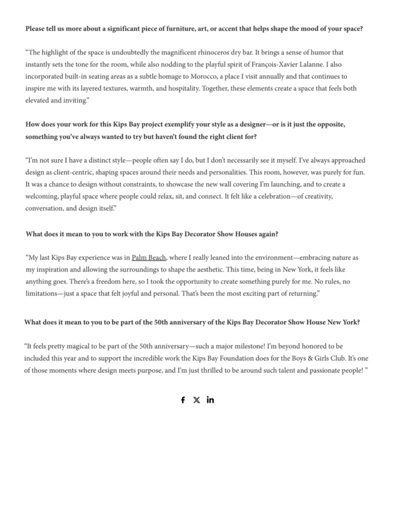 Her participation in Kips Bay continues to underscore her reputation as a designer who embraces risk and innovation. “Design should make you feel something,” she emphasizes. For Schumacher, that emotion often comes from creating interiors that are unapologetically bold—whether it is a layered powder room dripping in detail, a luxury living room framed in vibrant textiles, or a bespoke dining space enriched with global treasures. Each project channels her international upbringing, global travel, and personal history, weaving narrative threads into the fabric of her interiors.
