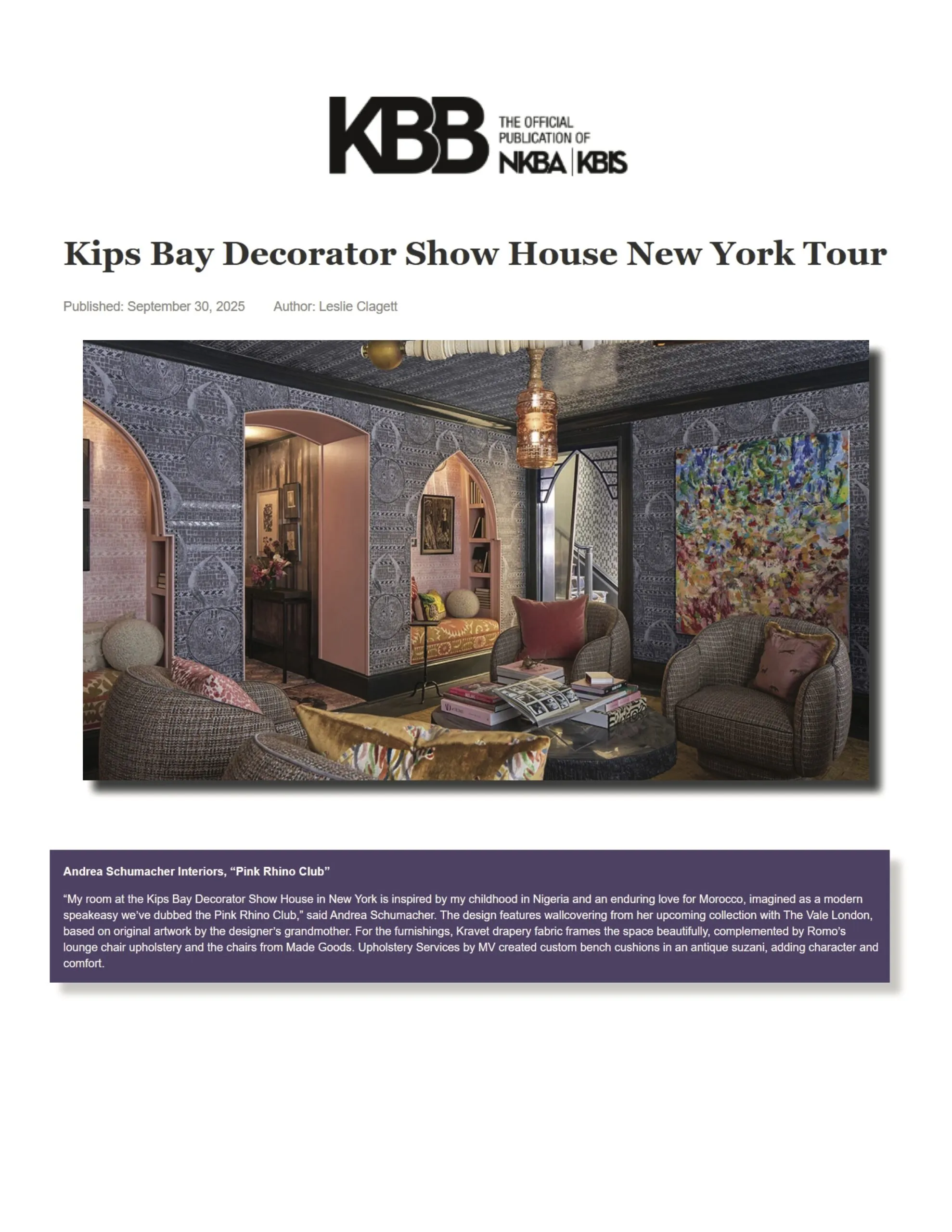 “My room at the Kips Bay Decorator Show House in New York is inspired by my childhood in Nigeria and an enduring love for Morocco, imagined as a modern speakeasy we’ve dubbed the Pink Rhino Club,” said Andrea Schumacher. The design features wallcovering from her upcoming collection with The Vale London, based on original artwork by the designer’s grandmother. For the furnishings, Kravet drapery fabric frames the space beautifully, complemented by Romo’s lounge chair upholstery and the chairs from Made Goods. Upholstery Services by MV created custom bench cushions in an antique suzani, adding character and comfort.”